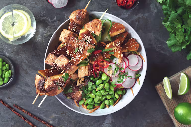 Buddha Bowl mit gegrillten Teriyaki-Quorn Filets und Ananas