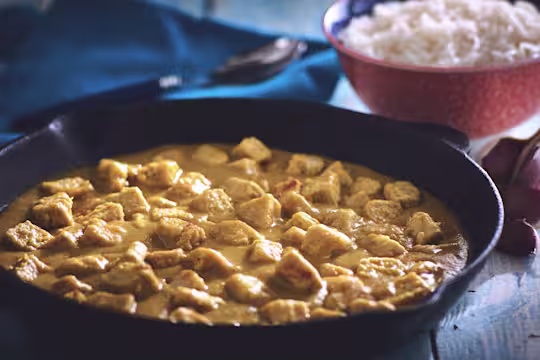- In der Zwischenzeit den Basmati-Reis in 7–8 Min. kochen und das Quorn Geschnetzeltes mit einem EL Olivenöl und der ungeschälten Knoblauchzehe in der Pfanne anbraten, bis es knusprig braun ist.